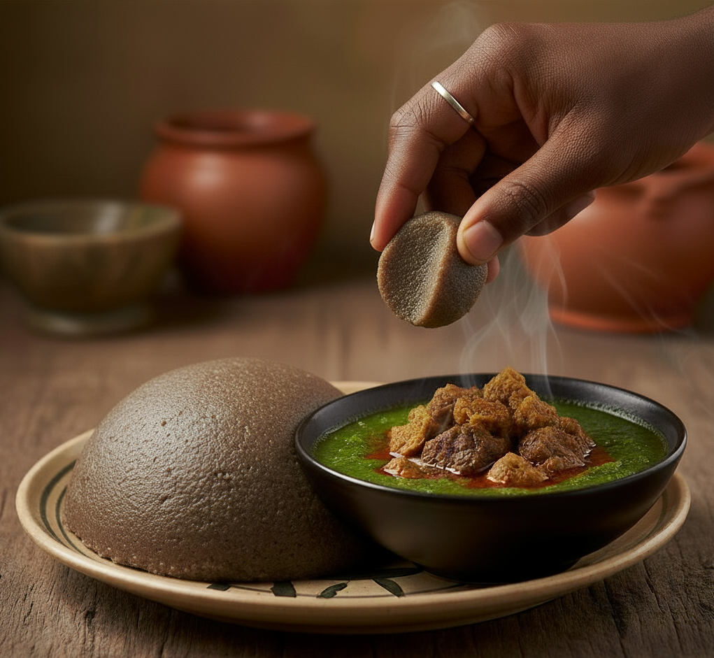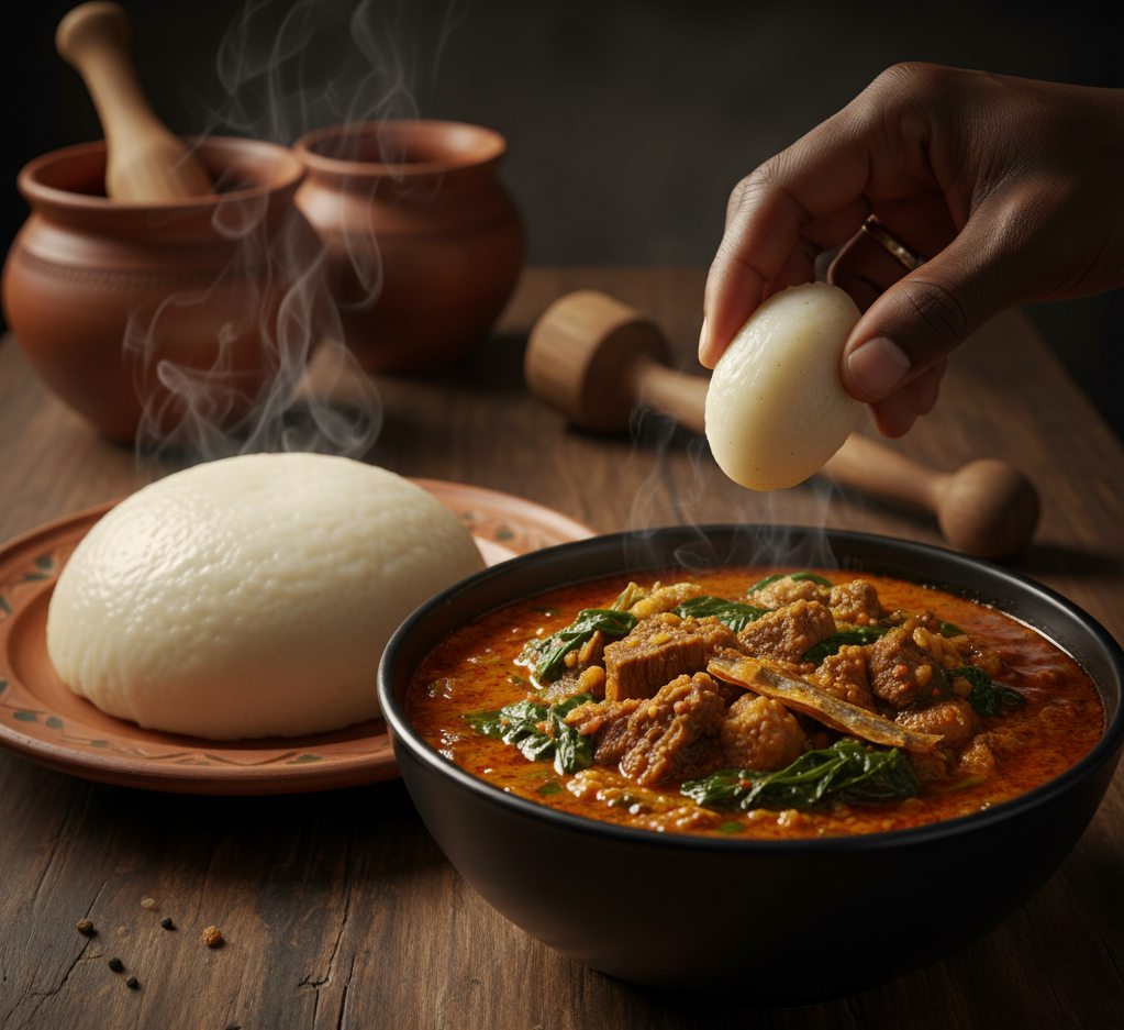 Rich egusi soup made with ground melon seeds, spinach, and assorted meat, served with smooth pounded yam.