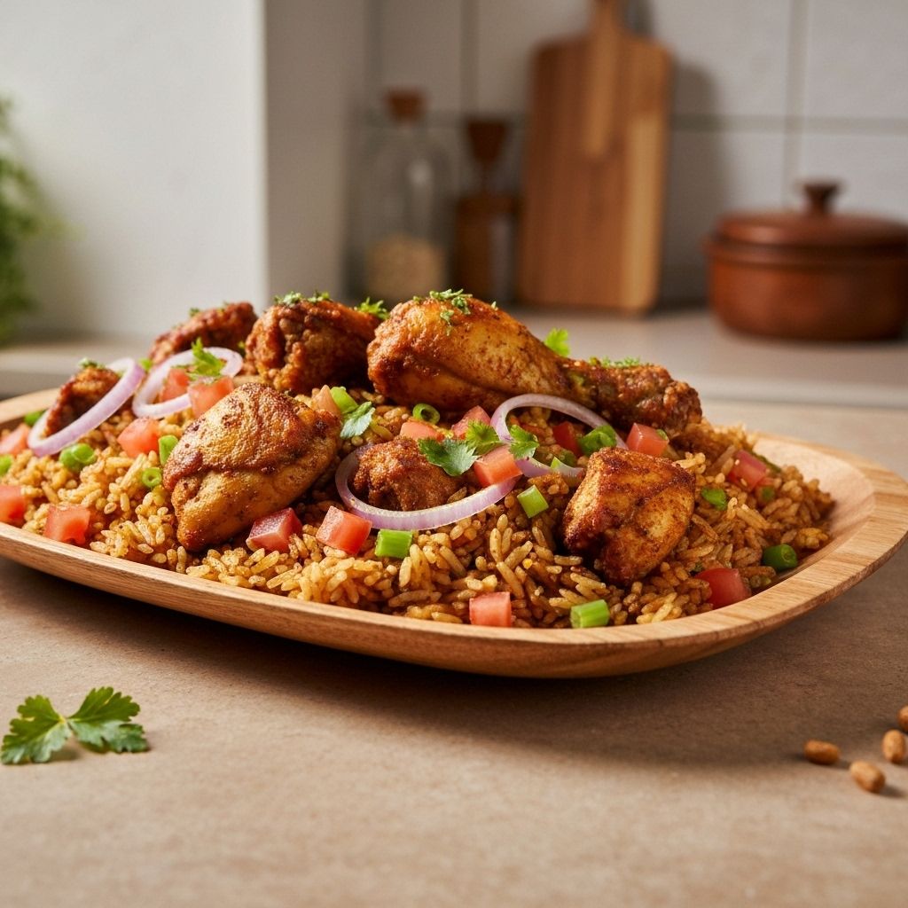 Colorful Nigerian fried rice with mixed vegetables, served with seasoned fried chicken.