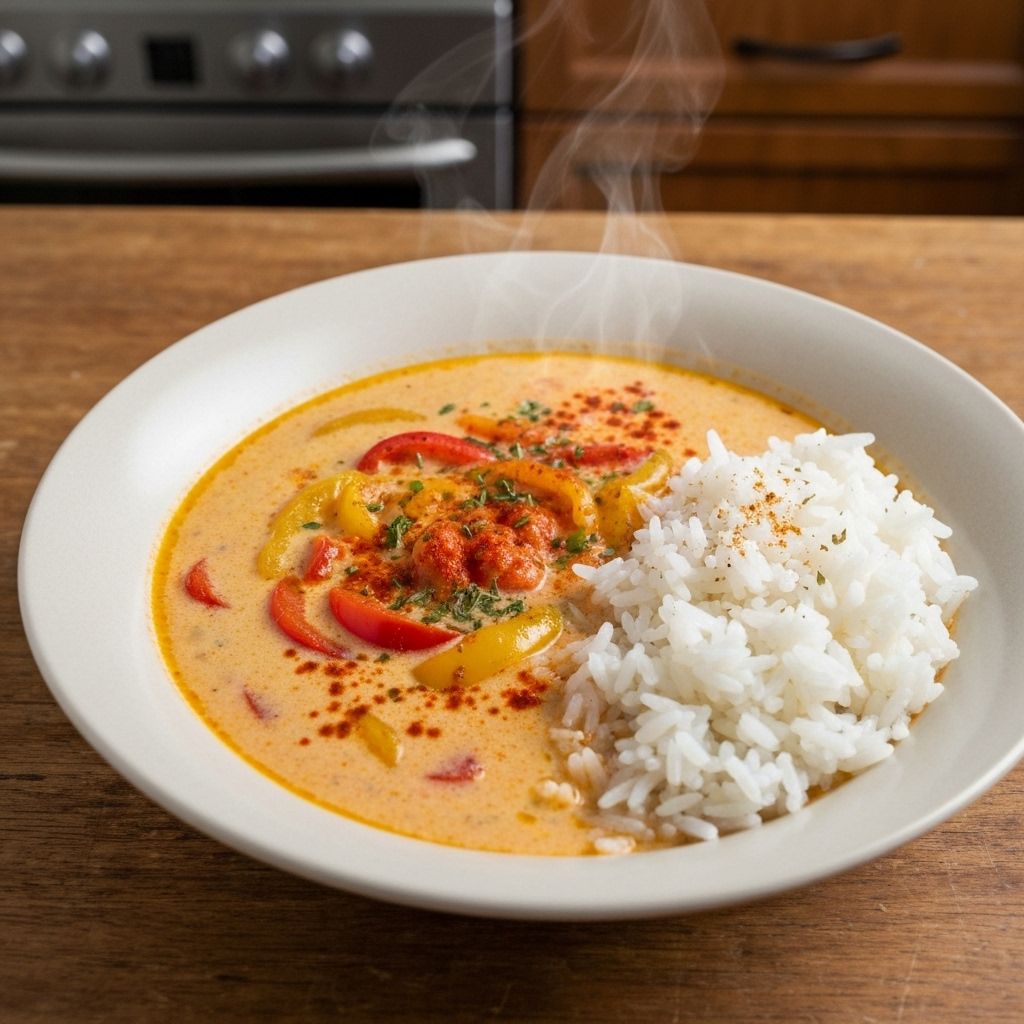 Aromatic pepper soup with fish and vegetables, served with steamed white rice and plantain.