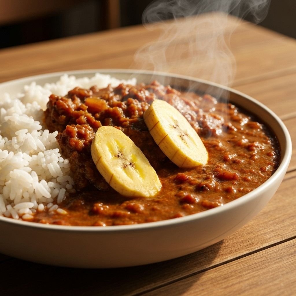 Classic Nigerian rice and tomato stew with beef, served with sweet fried plantains.